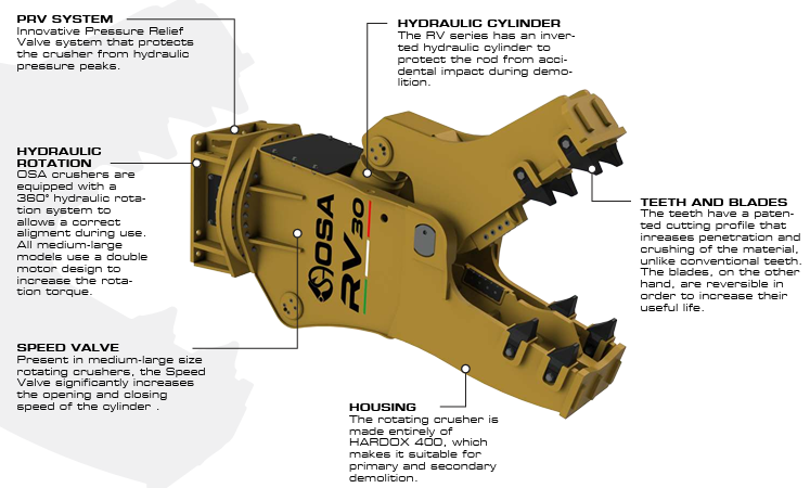 RV Hydraulic Rotating Pulverizers are engineered to meet both primary and secondary demolition requirements. Constructed with HARDOX 400, they are built to withstand wear and tear. These pulverizers feature a regenerative circuit for rapid jaw opening and closing. The 360° hydraulic rotation ensures precise positioning in any working condition. They all share the following characteristics: